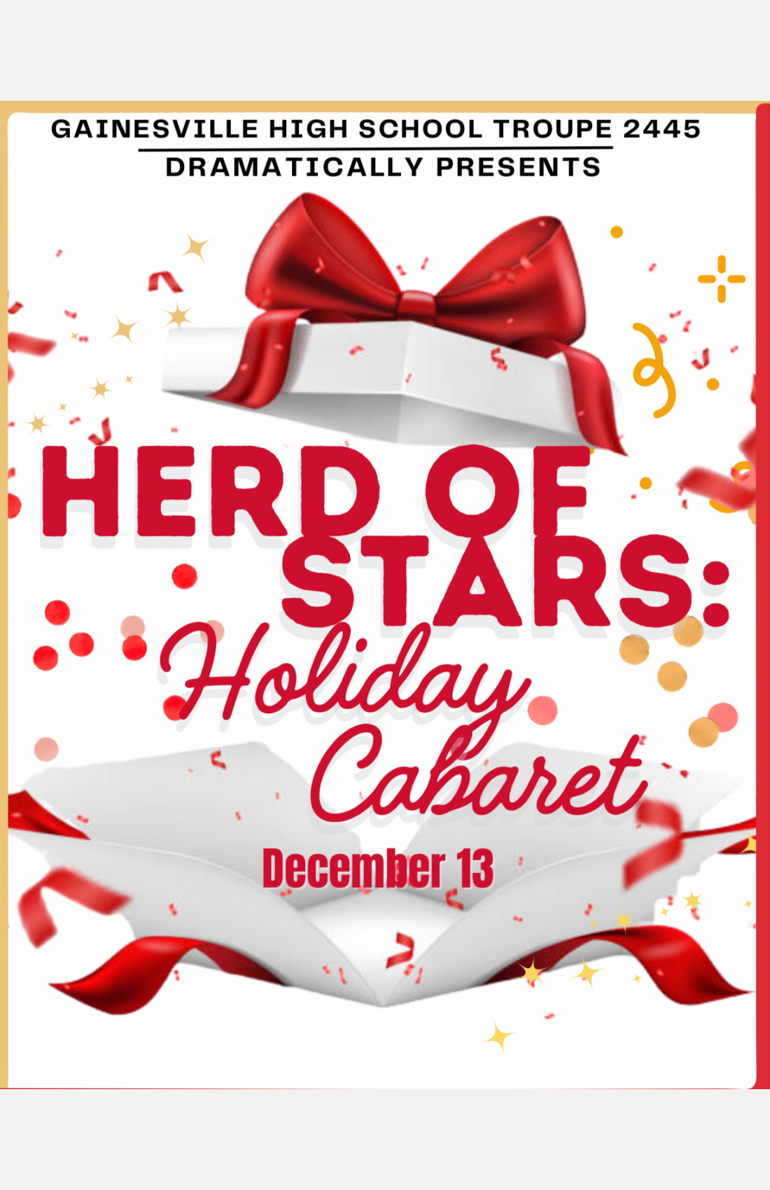 Get ready to be razzle dazzled and filled with Broadway Holiday Cheer! Join us for an enchanting evening of music, drama, and celebration as the Gainesville High School Theatre Department proudly presents its Holiday Theatrical Cabaret. This spirited showcase will feature dazzling performances by Thespians of the past, present, and future, bringing together alumni, current students, and rising stars for one magical night. From show-stopping numbers to heartwarming holiday classics, this event is the perfect way to celebrate the season with family, friends, and community.